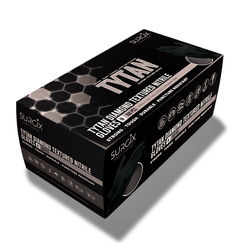 Black Tytan Diamond Texture HD disposable gloves are designed with a textured surface to provide excellent grip, sensitivity, and dexterity. Constructed from industrial-grade nitrile, they offer exceptional resistance to punctures and tears. Featuring a double-sided textured design, they are ideal for demanding tasks.